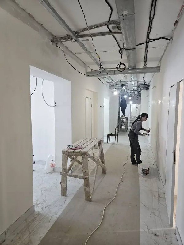 В 2026 году финансирование ремонта осуществляется за счет республиканского бюджета. На втором этапе строители ведут отделочные работы: штукатурят стены, делают стяжку пола, устанавливают новые дверные блоки, укладывают плитку и керамогранит. Все операции идут параллельно на всех четырех этажах и в подвальном помещении.